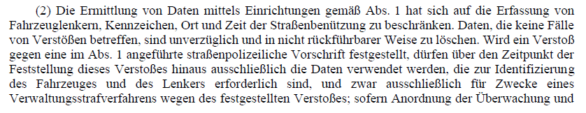 Eine kamerabasierte Überwachung von Busspuren, Geh- und Radwegen oder Fußgängerzonen als eigenständige Maßnahme soll hingegen nicht zulässig sein – mit Ausnahme der sogenannten Schulstraßen, wo der Verkehrsberuhigung ein besonderer Stellenwert zum Wohle der Schulkinder eingeräumt wird. Zudem sind im Begutachtungsentwurf einspurige Kraftfahrzeuge, wie Motorräder oder Mopeds, von der automatisierten Erfassung ausgenommen. Fragliche Punkte betreffen hier die Themen des Datenschutzes, der im Gesetzesentwurf so geregelt wurde: