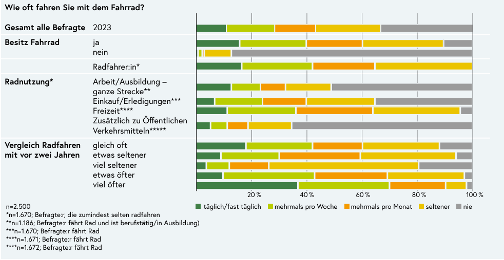 The survey provides interesting insights into combined mobility: 35% of cyclists occasionally combine cycling with public transportation, while 65% rely solely on their bike. This combination is especially popular among younger people and is noticeably more common in Vienna, Salzburg, and Vorarlberg than in other federal states.